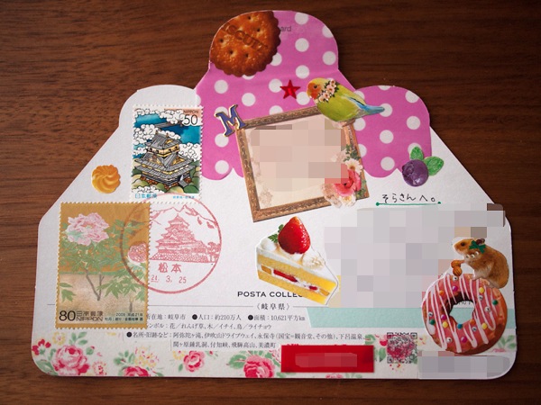 そして、松本郵便局の風景印が押されていました。図案は松本城と手まりです。切手は岐阜城と華やかな牡丹をセレクトしてくださいました。豪華絢爛な感じの切手と風景印、素敵ですね。